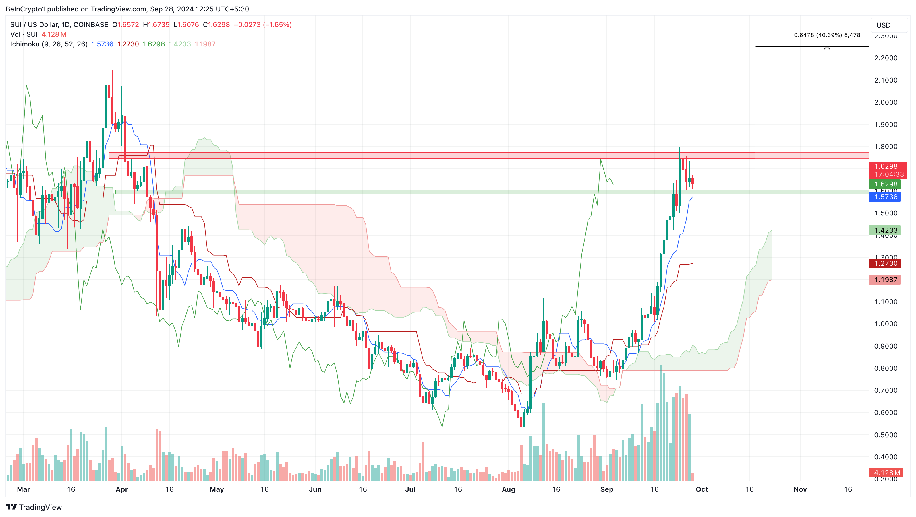 Yine de, geri çekilme token’i 1,60 dolar civarında bir destek bölgesine çekti ve bir geri dönüşü tetikleyebilir. Ek olarak, fiyat, önemli destek veya direnci gösteren bir teknik gösterge olan Ichimoku Bulutu’nun belirgin şekilde üzerinde. Bulut fiyatın üzerindeyse, güçlü bir direnç vardır ve fiyat düşebilir. Ancak SUI’nin fiyatının altında olduğu için daha yüksek bir değere ulaşma şansı sağlam.