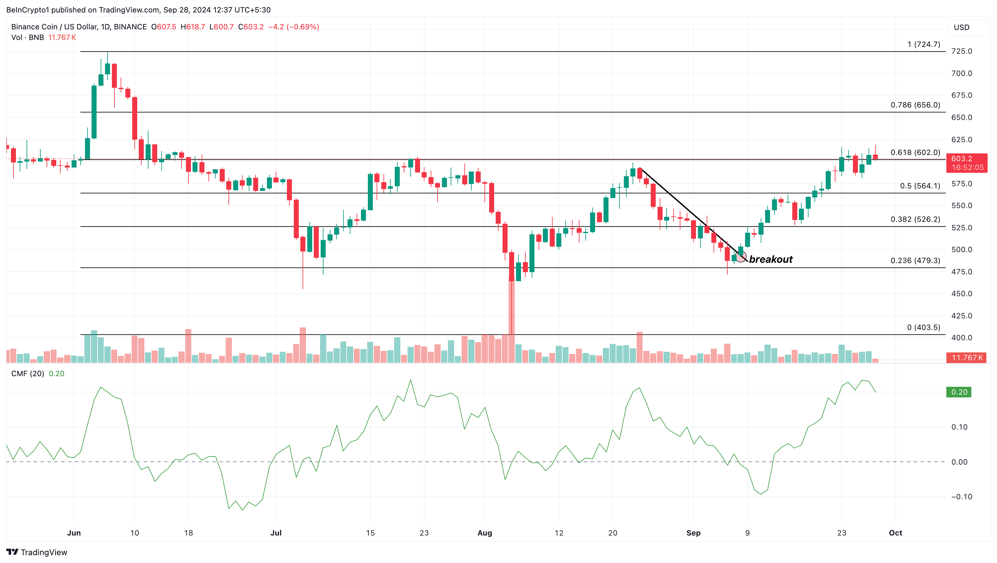 Bu nedenle, BNB’nin fiyatı bundan büyük ölçüde kazanç sağlayabilir. Bugün, altcoin’in fiyatı 602,20 dolar. Günlük grafikte, coin 8 Eylül’de düşüş trend çizgisinden çıktıktan sonra bu bölgeyi yeniden talep etmeyi başardı.