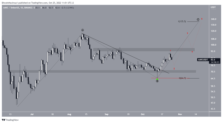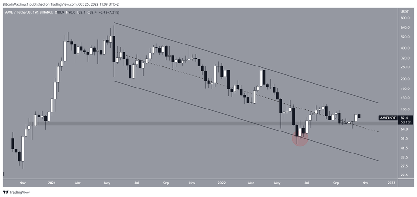 Haziran 2022’de AAVE, 71 dolarda yer alan uzun vadeli destek bölgesinden kırılım gerçekleştirdi. Ayrıca, uzun vadeli alçalan paralel kanalın alt çizgisi de destek olarak onaylandı (kırmızı daire).