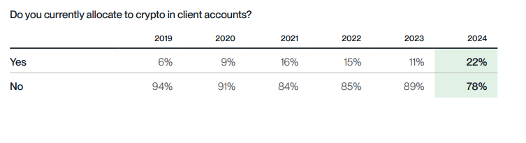 Müşteri portföylerine kripto para ekleyen danışmanların sayısı arttı. 2024 yılında, danışmanların %22’si müşteri hesaplarında kripto paraya yer verdiklerini bildirdi, bu oran 2023’te sadece %11’di.