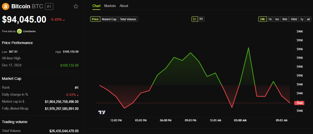 Bu yazı itibarıyla, Bitcoin 94.045 Dolar’dan işlem görüyor. BeInCrypto verilerine göre pazartesi günkü seans açılışından bu yana %0,5’lik bir düşüş yaşandı.