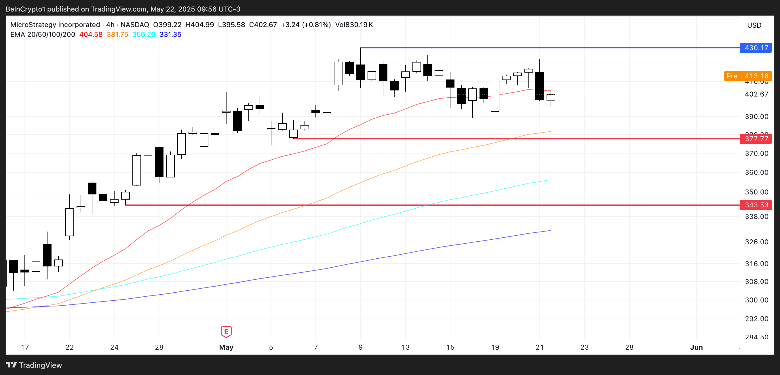 Strateji üzerindeki baskıya ek olarak, yöneticilerin hissedarları BTC maruziyeti konusunda yanılttığı iddiasıyla bir toplu dava açıldı. Teknik olarak, MSTR yükseliş trendinde kalmaya devam ediyor. Ancak momentum kaybederse, 377,77 Dolar’da destek test edilebilir ve daha fazla düşüşle 343 Dolar’a doğru ilerleyebilir.