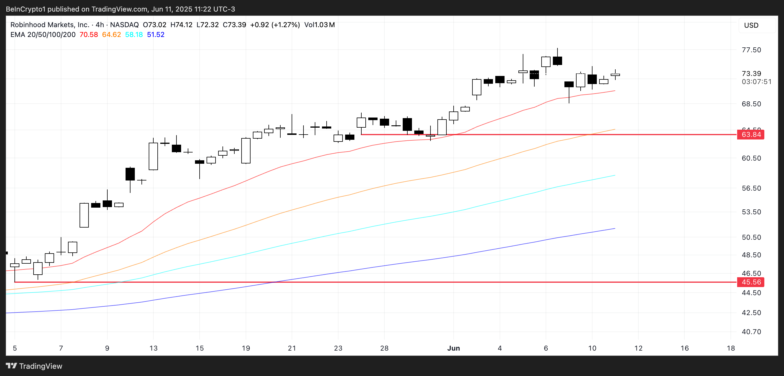 Mevcut momentum devam ederse, HOOD yakında 80 Dolar civarında yeni zirvelere ulaşabilir, ancak 63,84 Dolar’daki kilit desteğin altına düşmesi bir düzeltmeyi tetikleyebilir.