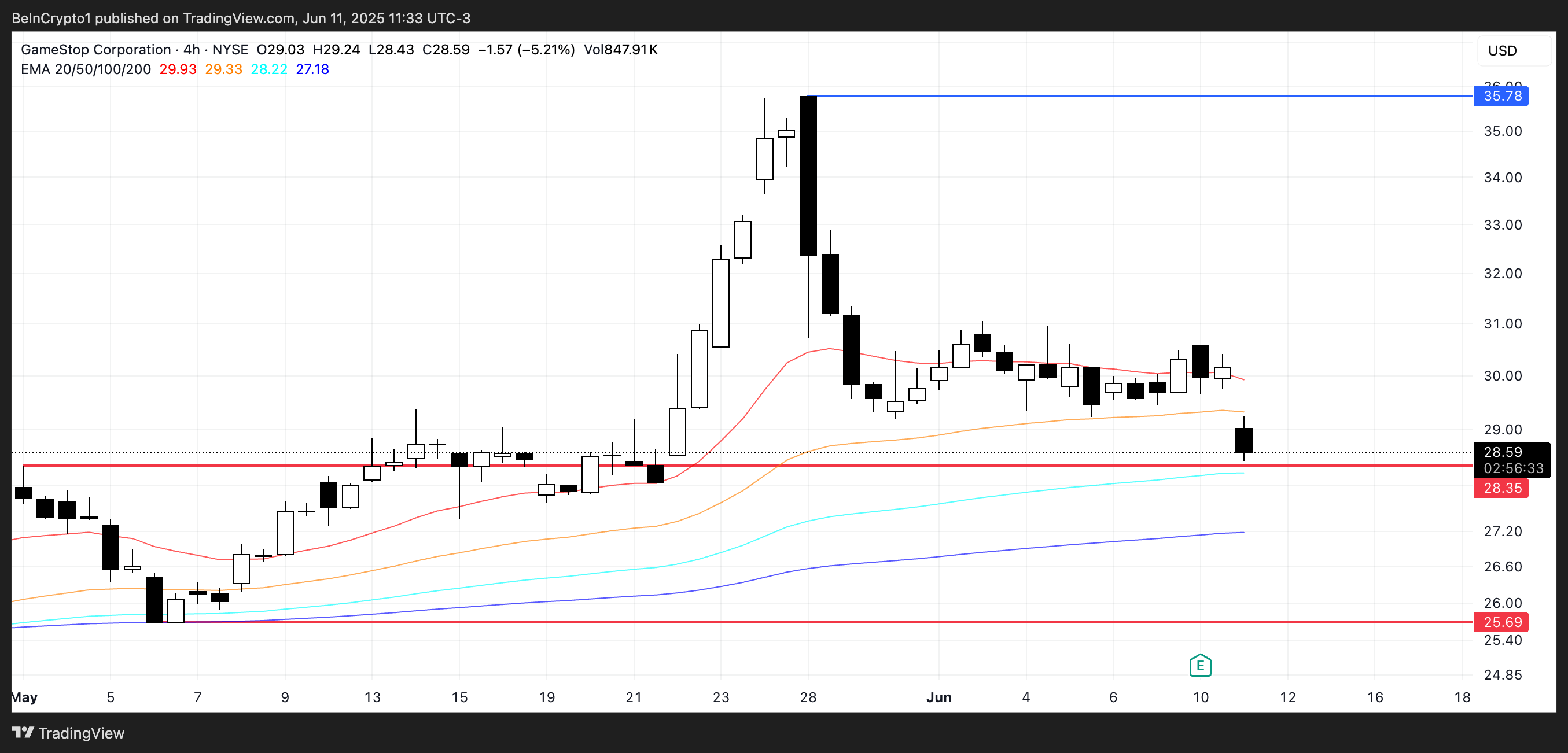 2025 yılı itibarıyla GME, yıl başından bu yana %8 düşüş gösterdi ve hisse şu anda önemli teknik seviyeleri test ediyor. Eğer 28,35 Dolar’daki destek tutunamazsa, bu durum 25,69 Dolar’a doğru daha fazla düşüşü tetikleyebilir.