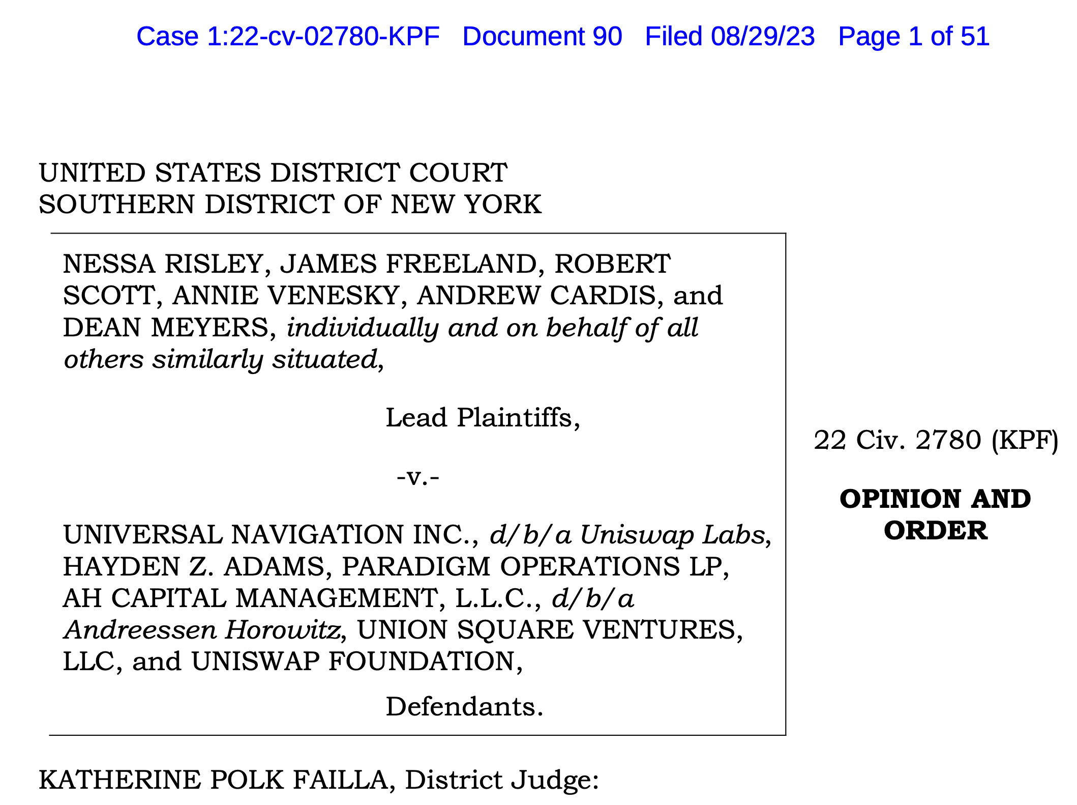 En büyük merkeziyetsiz borsa (DEX) olan Uniswap (UNI) hakkında, 2022 yılı Nisan ayında bir grup yatırımcı tarafından dava açılmıştı. Uniswap’in kurucu ekibini oluşturan Uniswap Labs’e açılan davanın sebebi, bir grup yatırımcının uygulama üzerinden aldığı token’lerin dolandırıcılık faaliyeti için araç olarak kullanılması. Mahkemenin hakîmi, davayı reddetti.
