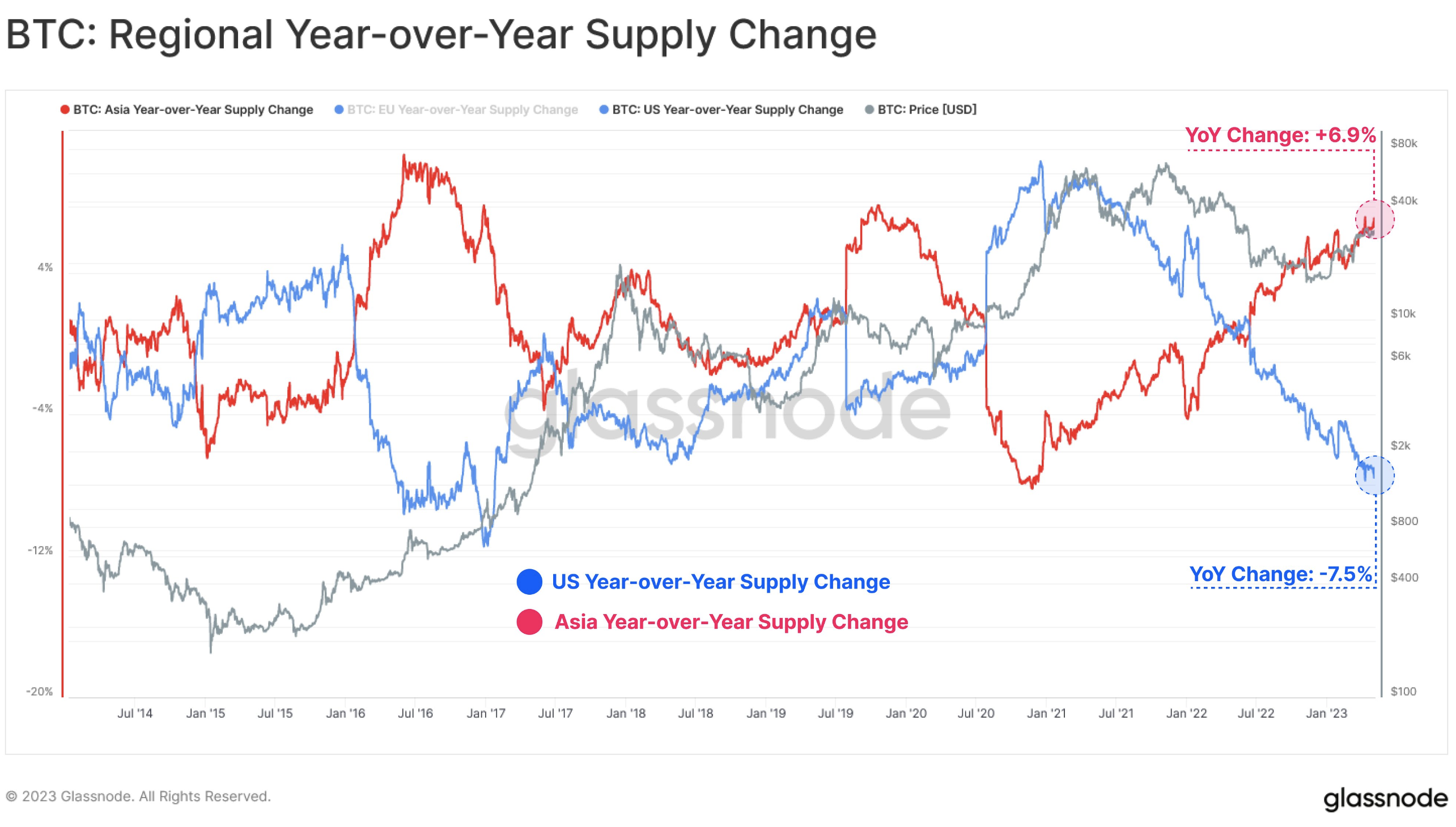 On-chain veri sağlayıcısı Glassnode, “yıldan yıla bölgesel arz değişim” metriğine dikkat çekti. Dolaşımda olan Bitcoin arzını ABD ve Asya saatlerine göre izleyen bu metrik, önemli bir değişim gösteriyor. Metrik, ABD merkezli kripto para yatırımcısı ağırlığının 2022’den bu yana Asya’nın gerisine düştüğünü göstermekte.