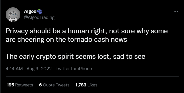 Sponsored“Gizlilik bir insan hakkı olmalı. Bazılarının neden Tornado Cash haberlerine sevindiğine emin değilim. Erken dönem kripto ruhu kaybolmuş görünüyor, bunu görmek üzücü.”