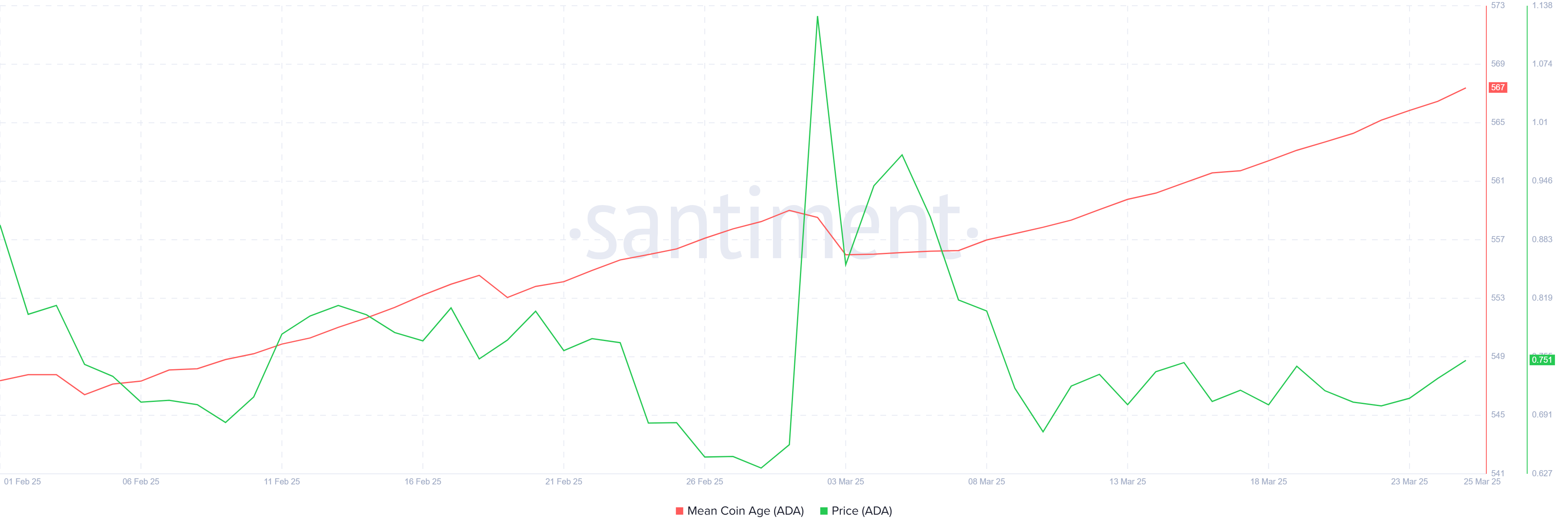 Cardano’nun makro ivmesi, genel düşüş eğilimindeki piyasa koşullarına rağmen umut verici işaretler gösteriyor. Dolaşımdaki coin’lerin ortalama yaşını izleyen bir metrik olan Ortalama Coin Yaşı, istikrarlı bir şekilde artıyor. Bu artış, uzun vadeli yatırımcıların (LTH’ler) satış yapmayı reddettiğini ve ADA token’larını uzun süre elde tuttuklarını gösteriyor. Bu durum, LTH’lerin Cardano’nun fiyatının toparlanmasına olan güvenini yansıtıyor.