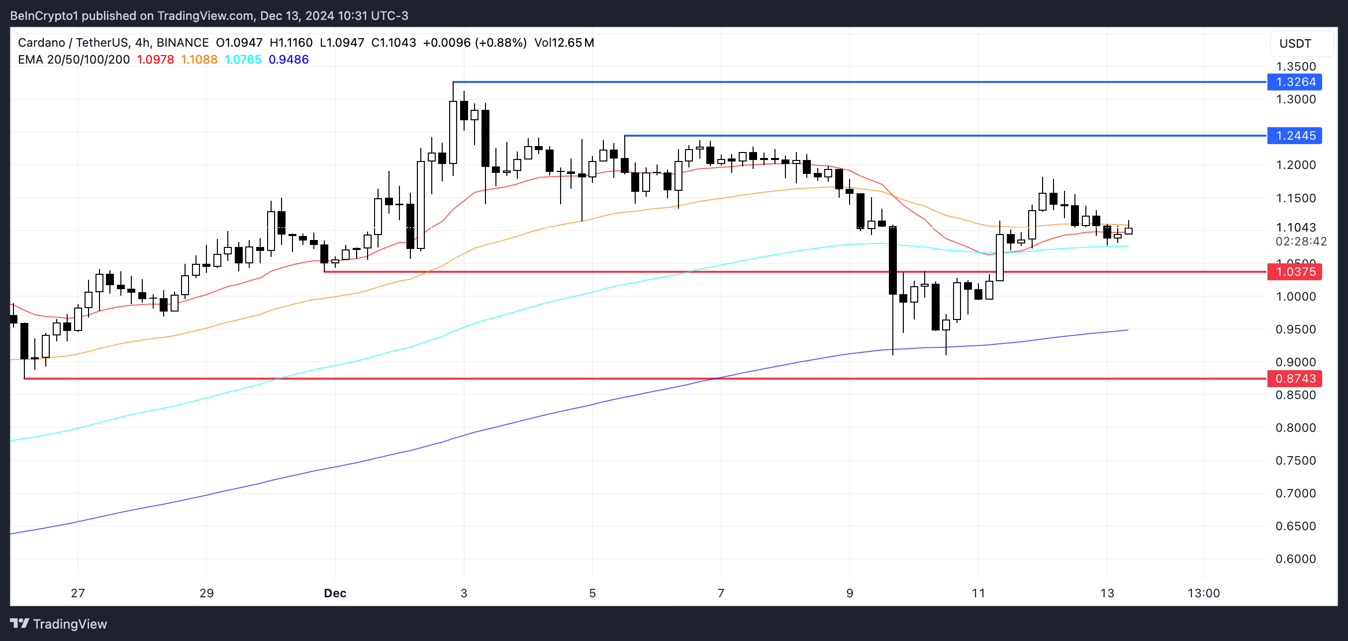 1,15 dolar desteğini kaybettikten sonra, Cardano fiyatı 1,10 dolara düştü. EMA çizgileri, üç tanesinin birbirine çok yakın işlem görmesi nedeniyle güçlü bir trendin olmadığını gösteriyor.