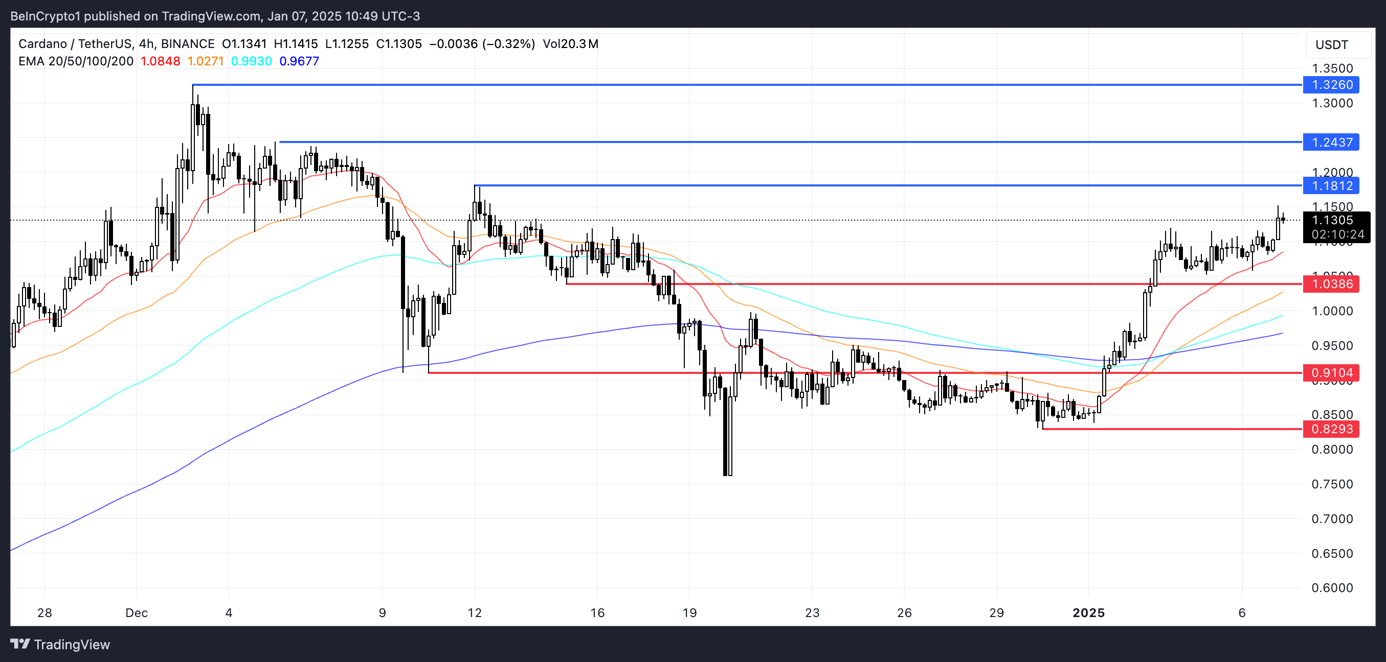Cardano fiyatı için EMA çizgileri, 2 Ocak ve 3 Ocak arasında iki altın kesişim oluşturdu ve bu da güçlü bir yükseliş ivmesini işaret ediyor. Bu altın kesişimler, ADA’nın son yedi günde %30 artış göstermesine katkıda bulundu.