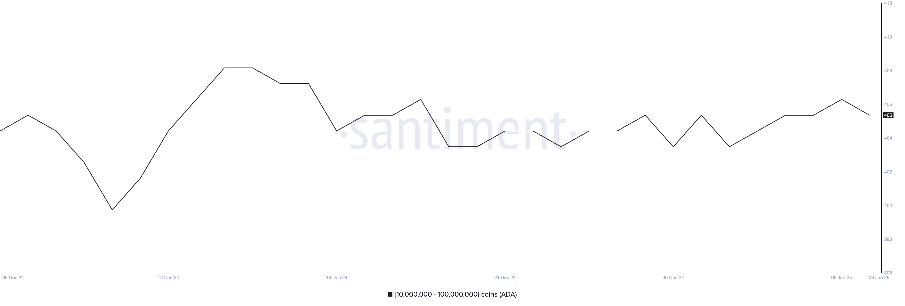 10 milyon ile 100 milyon ADA arasında tutan adresler olarak tanımlanan ADA balinalarının sayısı, 2025’in başından bu yana artış gösterdi. 1 Ocak’ta 404 olan sayı, 5 Ocak itibarıyla 407’ye yükseldi ve bu artış, büyük sahipler tarafından yenilenen birikimi gösteriyor.