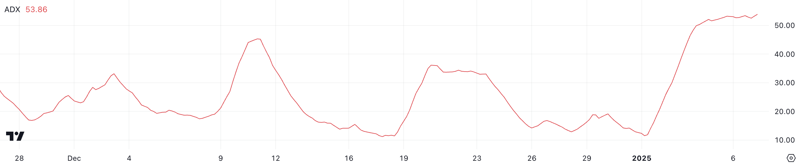 Cardano için Ortalama Yön Endeksi (ADX) şu anda 53,8 seviyesinde ve çok güçlü bir trendi işaret ediyor. ADX, trend gücünü 0 ile 100 arasında bir ölçekte değerlendirir; 25’in üzerindeki değerler güçlü bir trendi, 20’nin altındaki değerler ise zayıf veya yok olan bir ivmeyi gösterir.