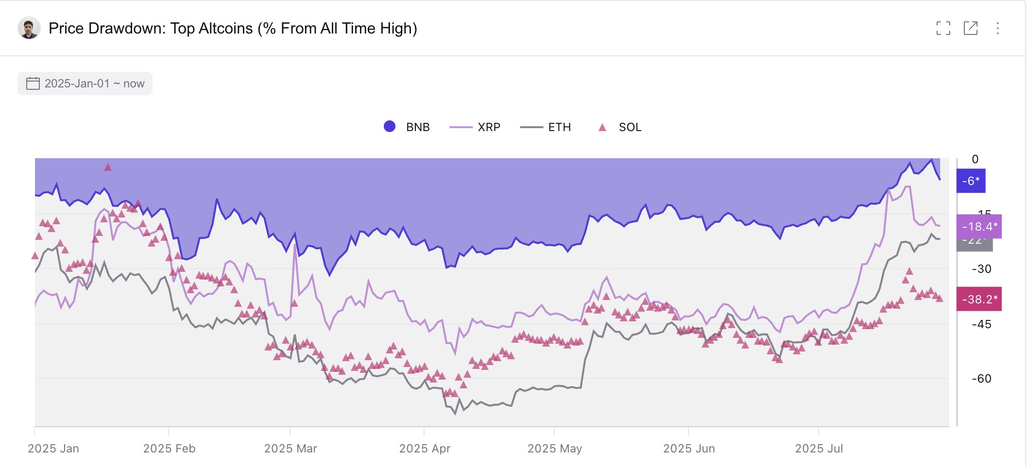 BNB’yi diğerlerinden ayıran, 2025 boyunca minimal düşüş trendi. Yılbaşından bu yana düşüş verilerine göre, tüm zamanların en yüksek seviyesinin %30’undan fazla düşmedi. Bu tutarlı direnç, volatilite ile bilinen bir piyasada nadir bir başarıdır.
