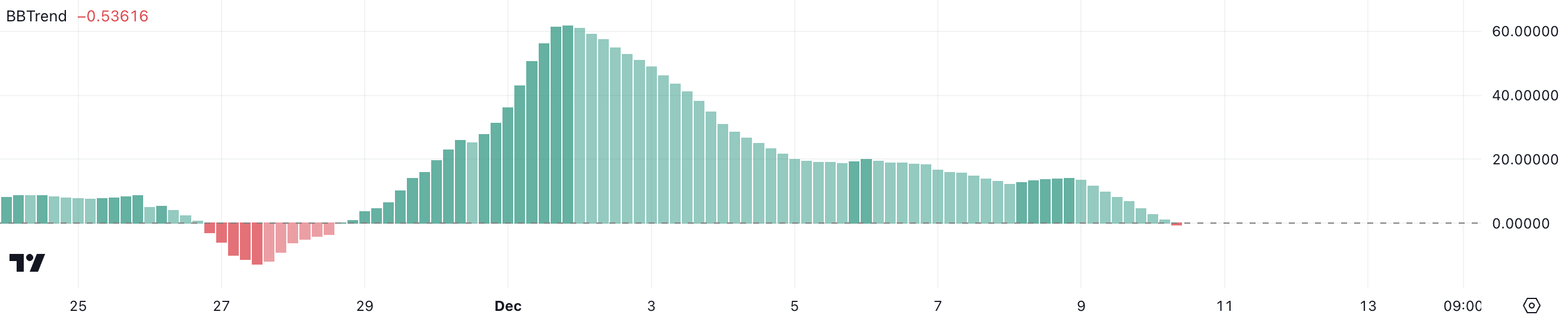 BBTrend, Bollinger Bantları’ndan türetilen ve trendin yönünü ölçen bir göstergedir ve piyasanın yükseliş veya düşüş aşamasında olup olmadığını değerlendirmeye yardımcı olur. Pozitif bir BBTrend genellikle yukarı yönlü momentum sinyali verirken, negatif bir okuma potansiyel bir düşüşü işaret eder.