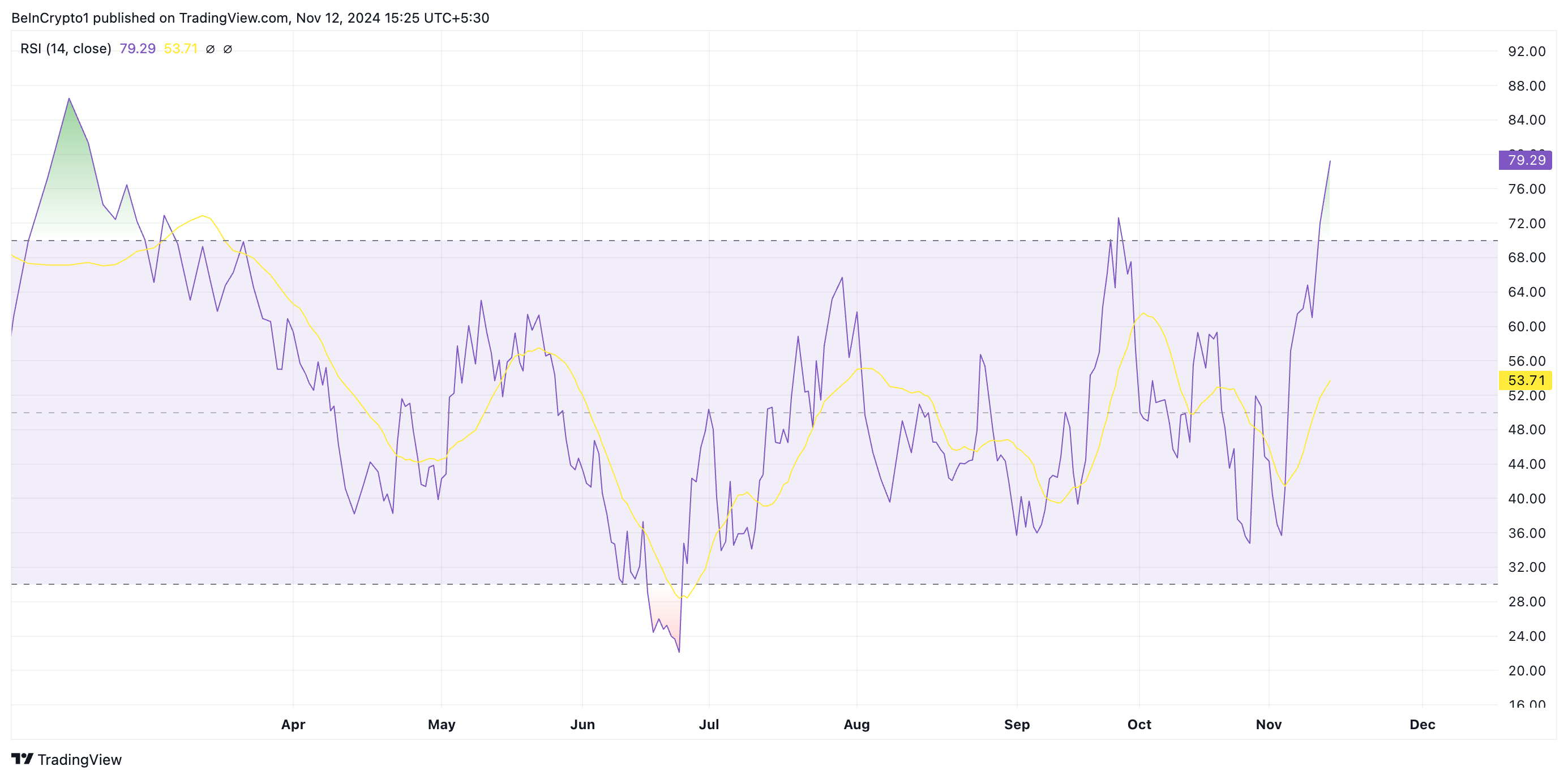 RSI göstergesi, bir varlığın aşırı alım ve aşırı satım piyasa koşullarını ölçer. Ölçek 0 ile 100 arasında değişir; 70’in üzerindeki değerler varlığın aşırı alındığını ve bir düzeltme ile karşılaşabileceğini, 30’un altındaki değerler ise aşırı satıldığını ve bir toparlanma için hazır olabileceğini gösterir.