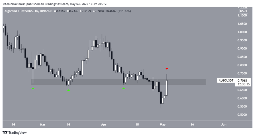 Algorand (ALGO) 24 Şubat’tan bu yana 0,70 dolardaki yatay destek bölgesi üzerinden üç kez sıçrama gerçekleştirdi (yeşil oklar). Ancak yukarı yönlü bir trend dönüşü meydana gelmedi. Buna ek olarak altcoin, 28 Nisan’da yatay destek bölgesinin altına geriledi.