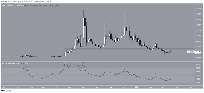 Cartesi (CTSI) kasım ayında tüm zamanların en yüksek seviyesi olan 1,73 dolara ulaştı. Ancak rekor seviyenin ardından bir düşüş hareketi başladı. Böylece altcoin, mayıs ayında 0,127 dolar seviyesinde dip oluşturdu.