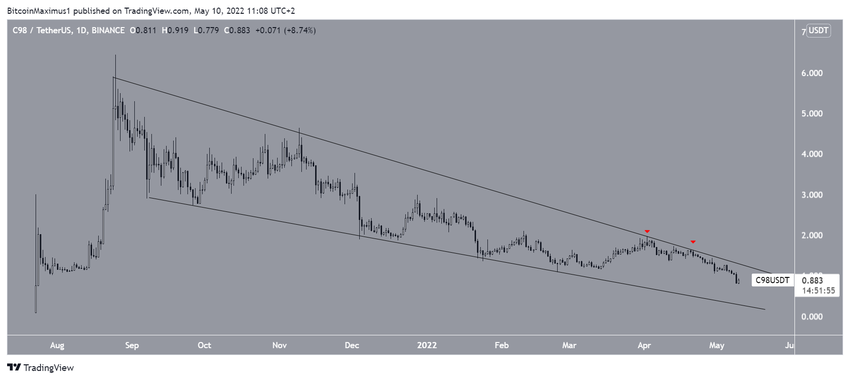 Coin98 (C98) 25 Ağustos’ta alçalan bir takoz formasyonu içinde değer kaybetmeye başladı. Ayrıca altcoin, formasyonun direnç çizgisinden birkaç kez reddedildi. Son reddedilme ise 21 Nisan’da gerçekleşti (kırmızı ok).