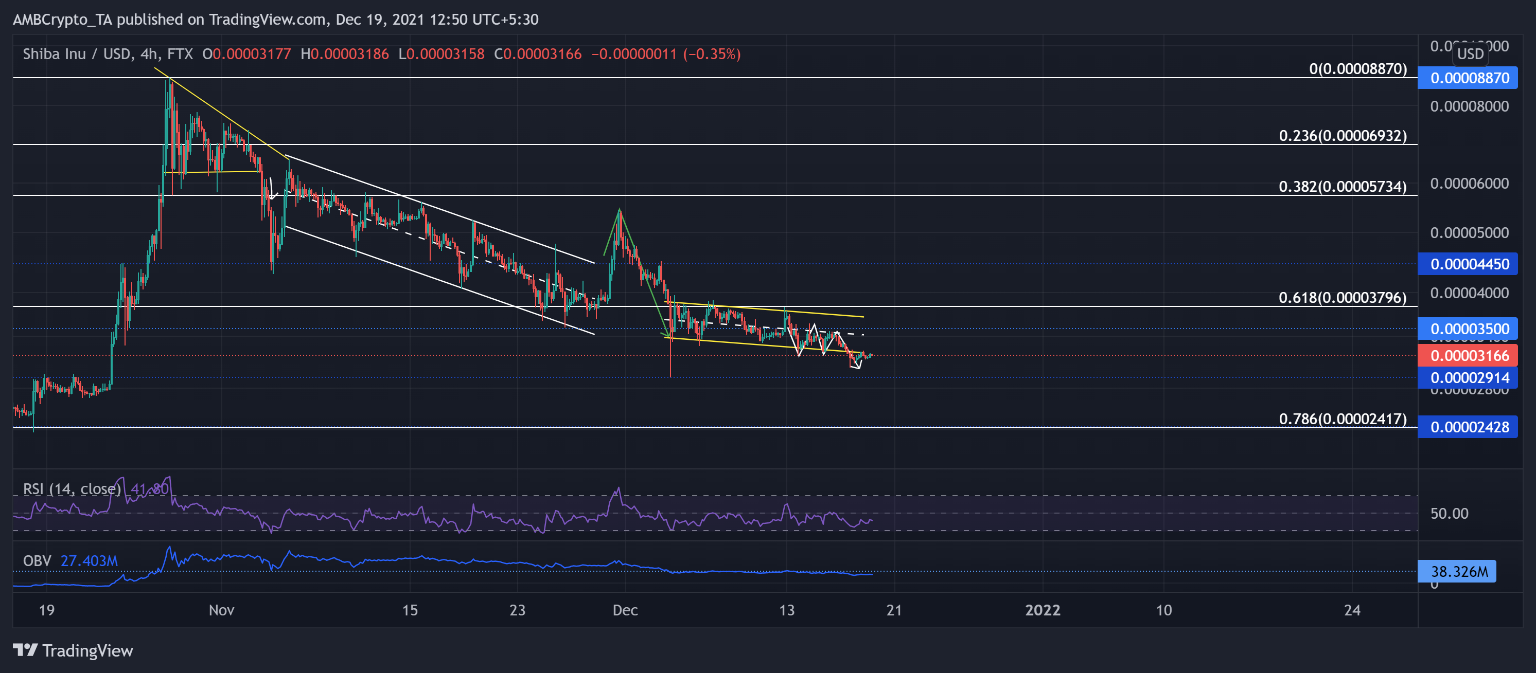“Altcoin grafiğinde 2 aralıkta bir anomali görüldü ancak son 15 gün içerisinde alçalan bir kanal oluştu. Shiba Inu 2 Aralık’tan bu yana, yalnızca 18 günlük bir süreçte %40’ın üzerinde bir düşüşe tanık oldu. Bu düşüş sonucunda, %61,8 Fibonacci seviyesi kaybedildi ve ayılar böylece 0,000035 desteğini kırdı.