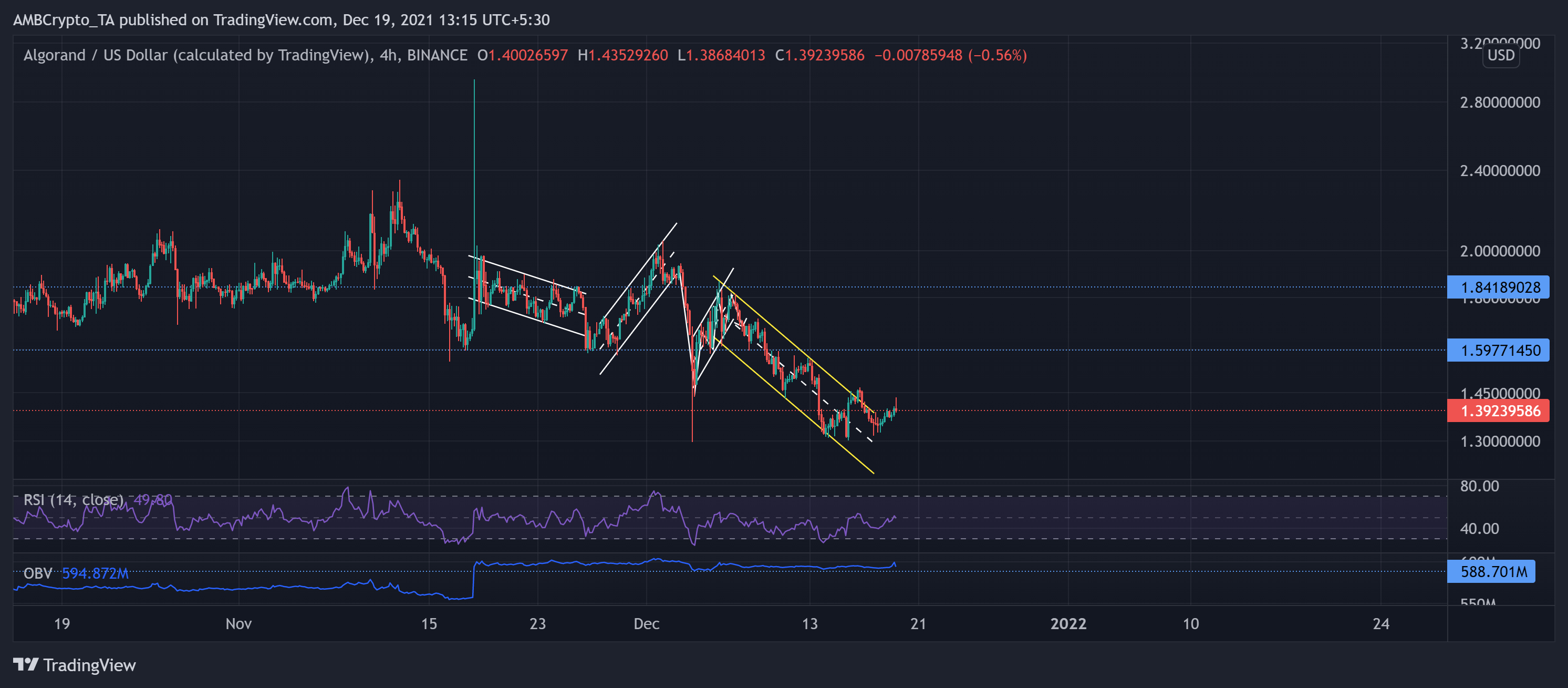 “ALGO 1,84 doların altına düştüğü için önemli bir düşüş gördü. Bu düşüşün kırılım noktalarından biri ise 3 Aralık’ta boğaların yükselen bir kanal oluştururken satış baskısına karşı koyamamasından kaynaklandı. Sonuç olarak, ayılar aşağı yönlü bir bayrak oluşturduktan sonra, fiyatı 1,59 doların (üç aylık direnç) altına taşıdı.