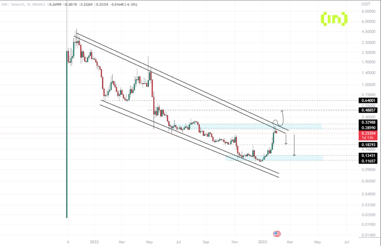 Mines of Dalarnia son 7 gün içerisinde %40’ın üzerinde değer kazandı. Şimdi altcoin fiyatının takip edeceği destek ve direnç seviyeleri merak ediliyor. Analist Yağmur Bayoğlu, DAR Coin fiyatının önemli bir direnç seviyesinden tepki aldığına dikkat çekti. Deneyimli analist, DAR Coin’de yükselişin devamlılığı için 0,32 dolar direncinin kırılması gerektiğine işaret ediyor: