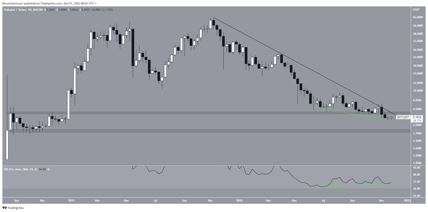 Polkadot, Kasım 2021’de 55,1 dolara ulaşarak rekor kırdıktan sonra alçalan direnç çizgisi altında değer kaybetmeye başladı. Aşağı yönlü hareket sonucunda Kasım 2022’de 5 dolar seviyesini gördü. Bu da uzun vadeli destek olan 6 dolardan kırılıma sebep oldu.