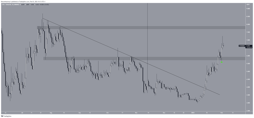 CVX fiyatı, Ocak’ta iki katına çıktı. 14 Ocak günü alçalan direnç çizgisinden çıkış yaptı ve bu altcoin, 2 Şubat’ta 7,26 dolara ulaştı. Yükselişle beraber 5,90 dolar direnç bölgesini de tekrar ele geçirdi. Trendin tersine dönmesi durumunda bu seviye, destek görevi görecektir.
