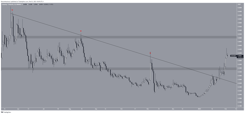 Üç başarısız denemenin ardından LRC fiyatı, 24 Ocak’ta alçalan direnç çizgisinden çıkış yaptı. 2 Şubat’ta 0,45 dolara kadar ulaştı. Yükselişle beraber 0,34 dolar yatay direnç bölgesinden de çıkış geldi.