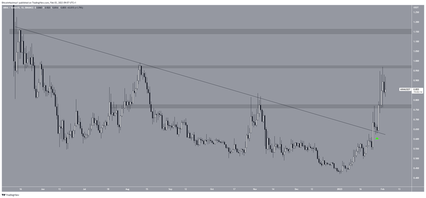 MINA fiyatı, 25 Ocak’ta alçalan direnç çizgisinden çıkış yaptı ve iki gün sonra burayı destek olarak onayladı (yeşil simge). Ardından yükselişe başladı ve 0,97 dolara kadar ulaştı.