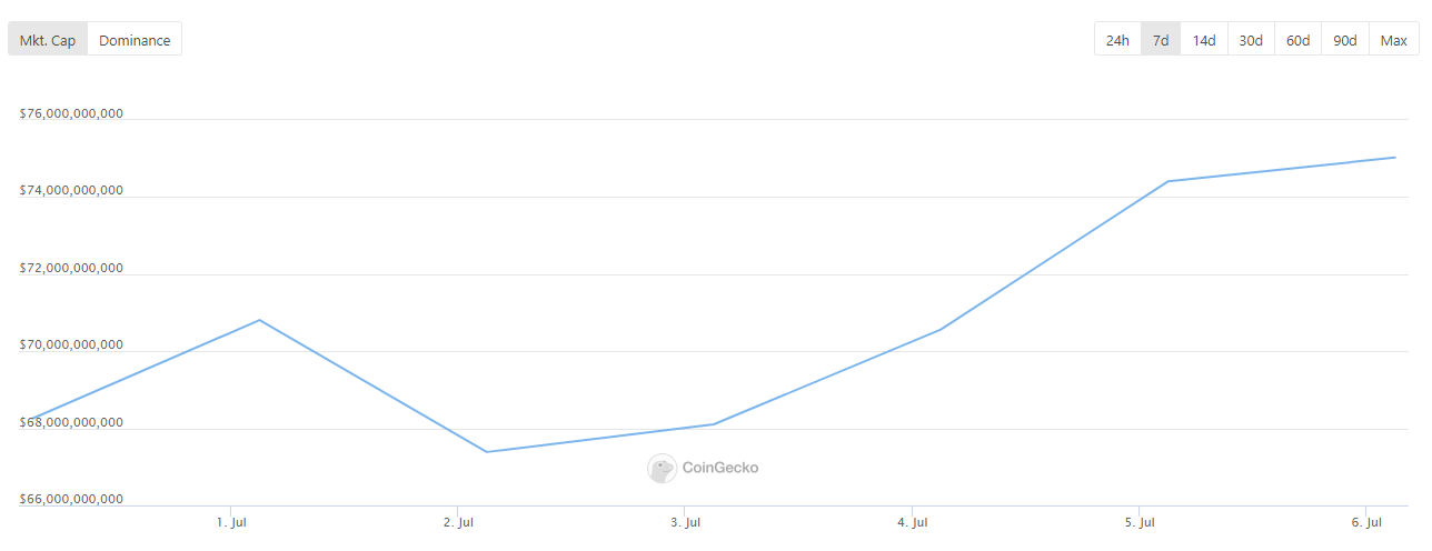 Kripto para piyasasının toplam değeri son 24 saat içerisinde %2 kadar yükseliş gördü ve bu yükseliş 70 milyar dolar değerinde bir kazanıma eş değer. Görülen yükselişle birlikte kripto para piyasası gün içinde toparlanma belirtileri göstermeye başladı.