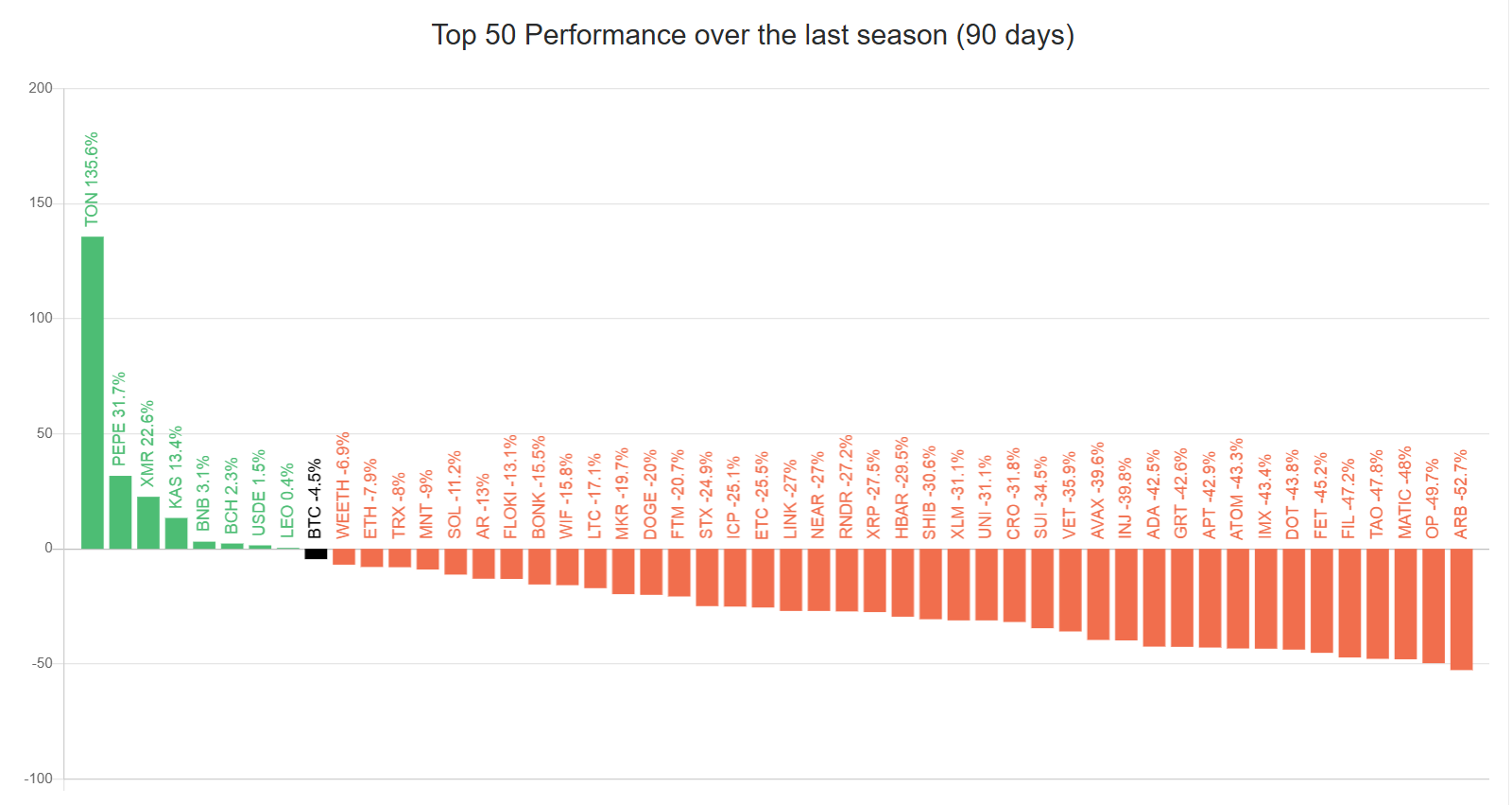 Bir diğer yandan, son 90 gün içinde yalnızca sekiz kripto para Bitcoin’den daha iyi bir performans sergiledi. Meme coinlere karşı artan ilgi ve spot Ethereum ETF onayı bile altcoinlerin değerini yükseltemedi.