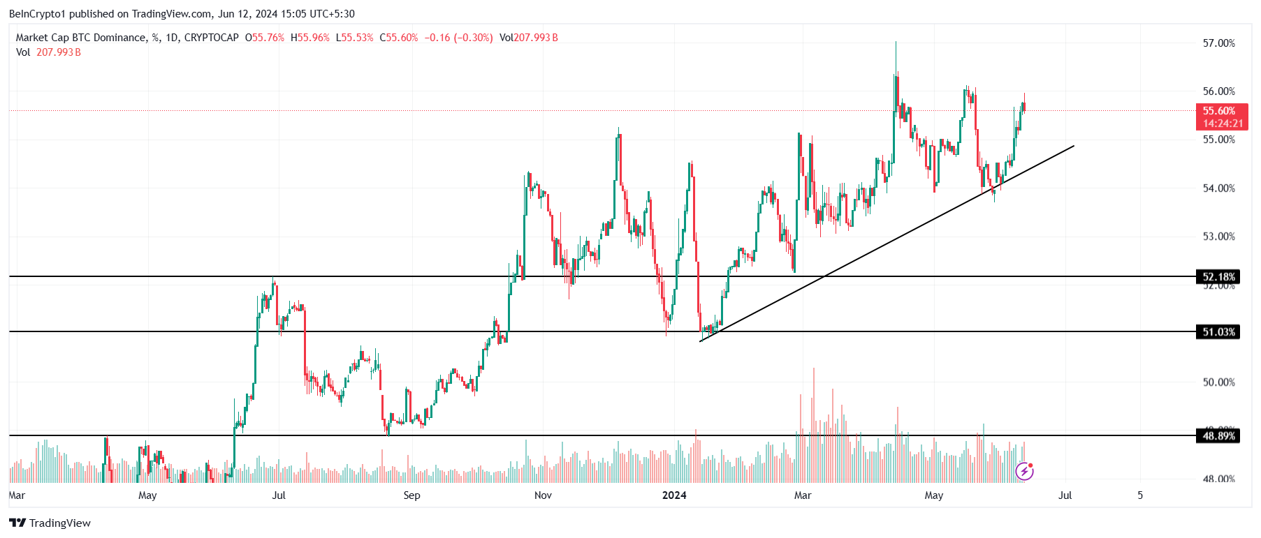 Bu düşüş, en son Ocak’ta BTC’nin hakimiyetinin %54’ten %50’ye düşmesiyle kaydedildi. O zamandan beri, BTC’nin hakimiyeti yükselerek %55’e ulaştı. Bu değer, 2021’in Mart ayında BTC hakimiyetinin %70’ten %40’a düştüğü zamandan beri en yüksek seviye.