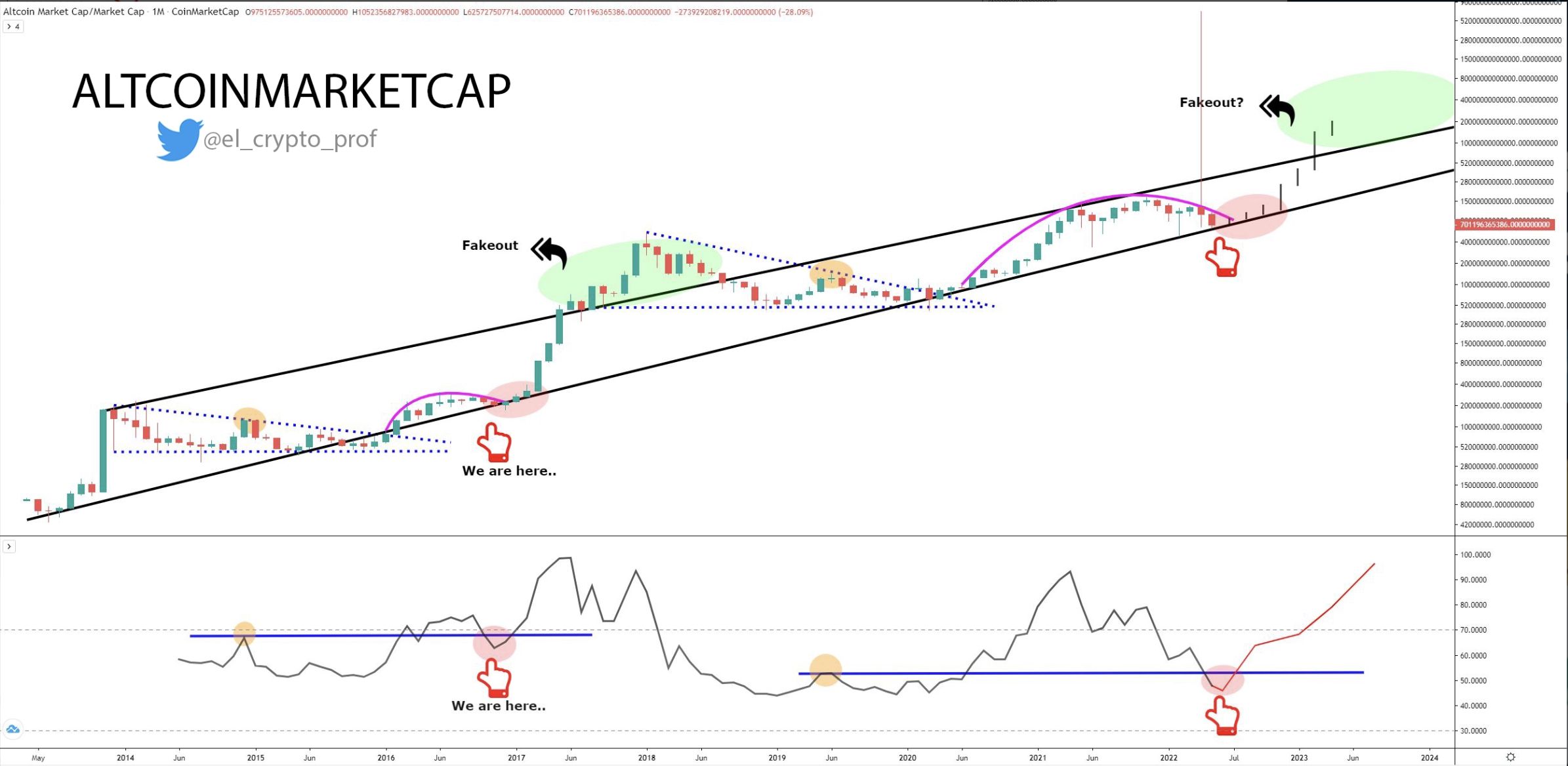 Altcoin piyasalarının toplam değerine ve geçmiş değer hareketlerine bakarak oluşturulan aşağıdaki grafik, olası bir ralliye yaklaştığımızı gösteriyor. Analist El_Crypto_Prof, aşağıda yer alan grafiği baz alarak piyasanın bir kırılma noktasına yaklaştığını bildirdi. Kripto para analisti, altcoinlerin mevcut piyasa değerinin önceki döngüye işaret ettiğini ve RSI’ın bu iddiayı desteklediğini ifade ediyor: