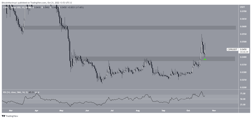 CSPR fiyatı, Mayıs ayının başlarından bu yana 0,039 dolar direnç bölgesinin altında hareket ediyordu. Kayda değer bir yükseliş hareketinden sonra CSPR, 16 Ekim’de direnci geçmeyi başardı ve ertesi gün, 0,055 dolara kadar ulaştı.