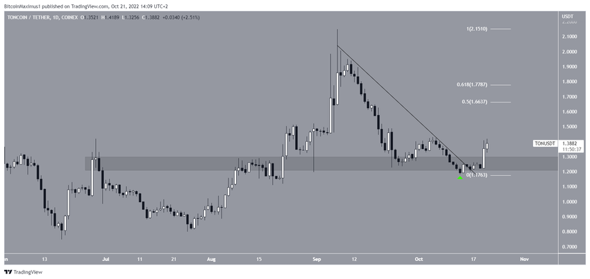 TON, 13 Ekim’de 1,25 dolar yatay destek bölgesinden sıçradıktan sonra yükselişe geçti (yeşil simge). Kısa bir süre sonra ise alçalan direnç çizgisi geçildi.