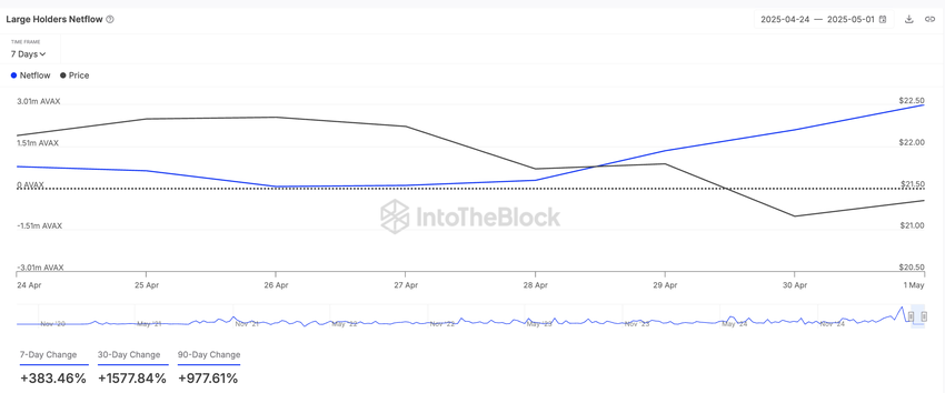 Layer-1 (L1) coin AVAX, bu hafta balinaların artan ilgisini gördü ve bu durum, büyük sahiplerin net akışındaki artışla yansıdı. IntoTheBlock’a göre, bu oran son yedi günde %380’in üzerinde arttı.