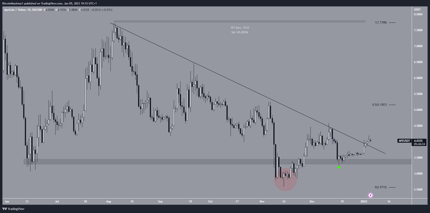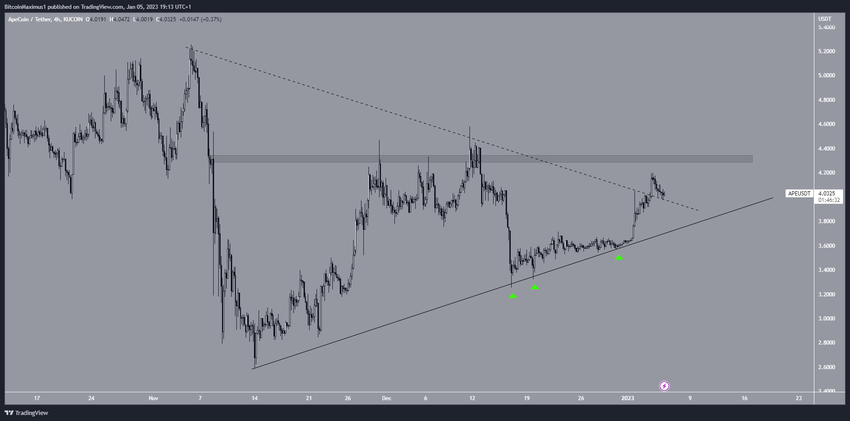 4 saatlik grafiğin teknik analizine göre APE, 13 Kasım’dan beri yükselen destek çizgisini takip ediyor. Fiyat bu çizgiyi, en sonuncusu 30 Aralık’ta olmak üzere birçok defa test etti.