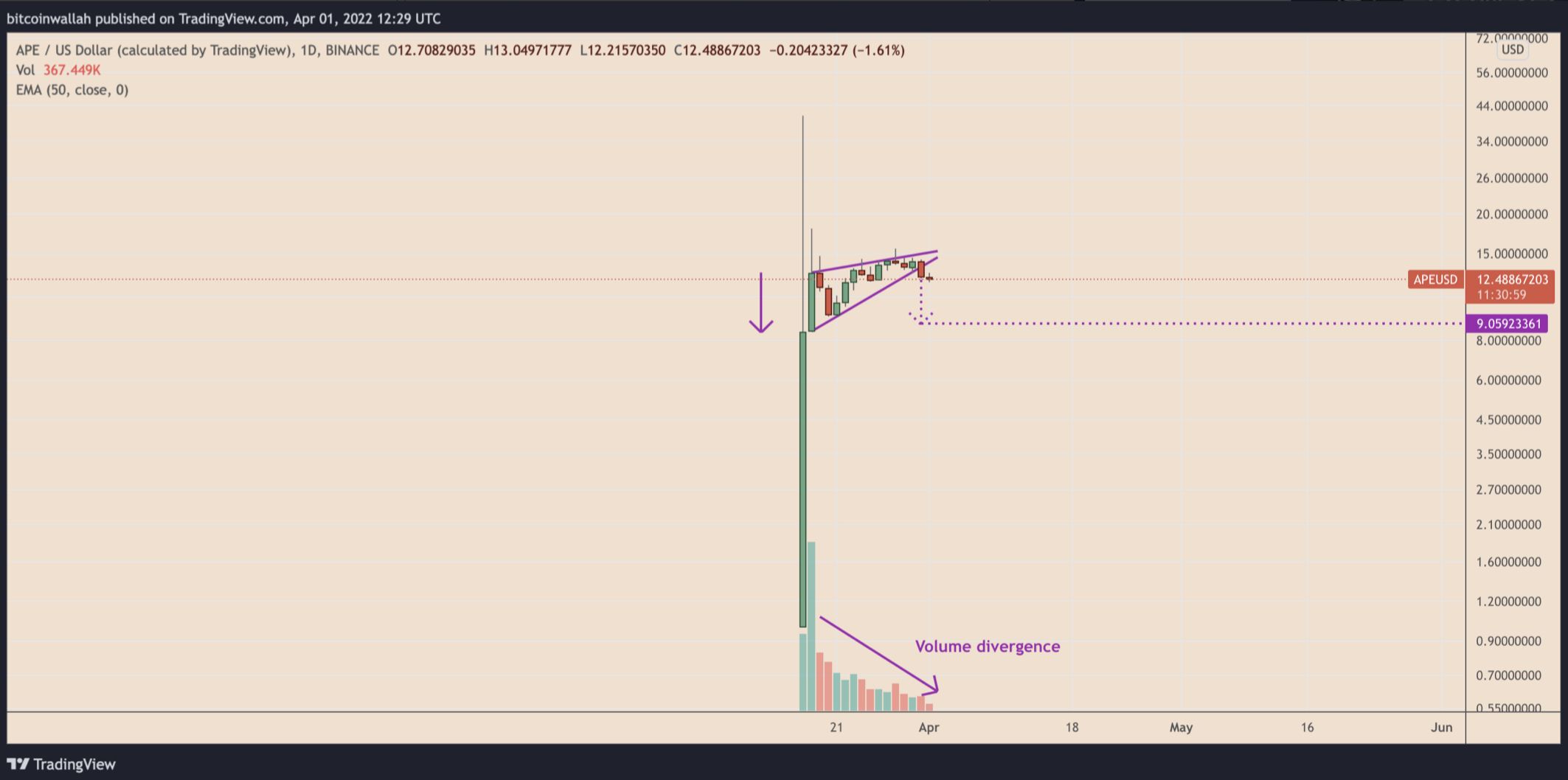 Kripto para analisti Gola, ApeCoin’in hızla düşen hacmine dikkat çekiyor. Analiste göre, düşen hacimler formasyonu destekliyor: