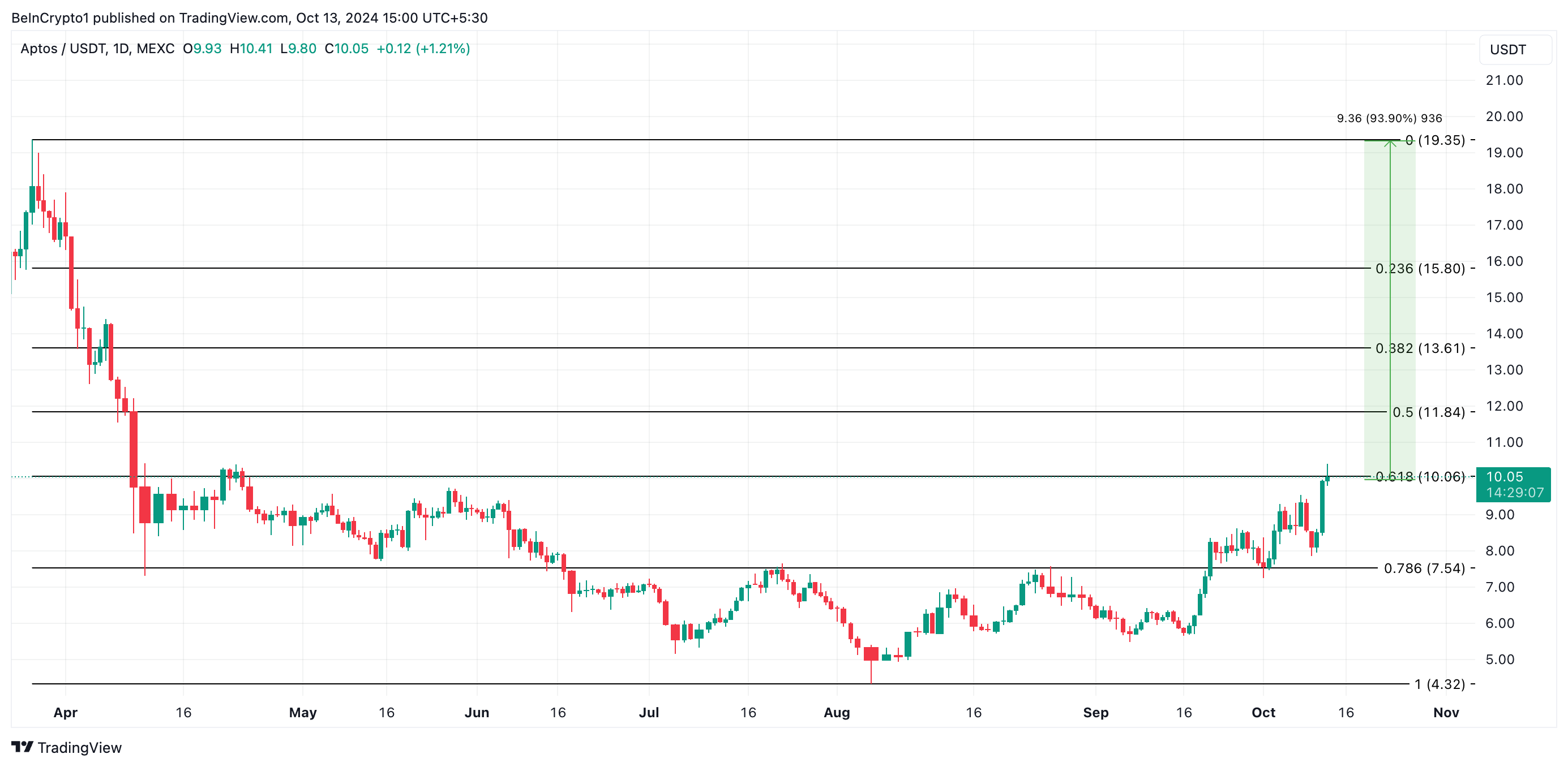 Layer-1 blockchain ağı Aptos’un yönetim token’ı olan APT, son 24 saatte %17’lik bir artış gösterdi. Şu anda 10,05 dolar’dan işlem görüyor. Bu süre zarfında piyasa değerine göre ilk 100 kripto para arasında en iyi performansı sergileyen oldu. Kripto para analistlerinin yapmış olduğu APT yorum ve fiyat analizlerine göre, coin fiyatı %94 artışa hazır.