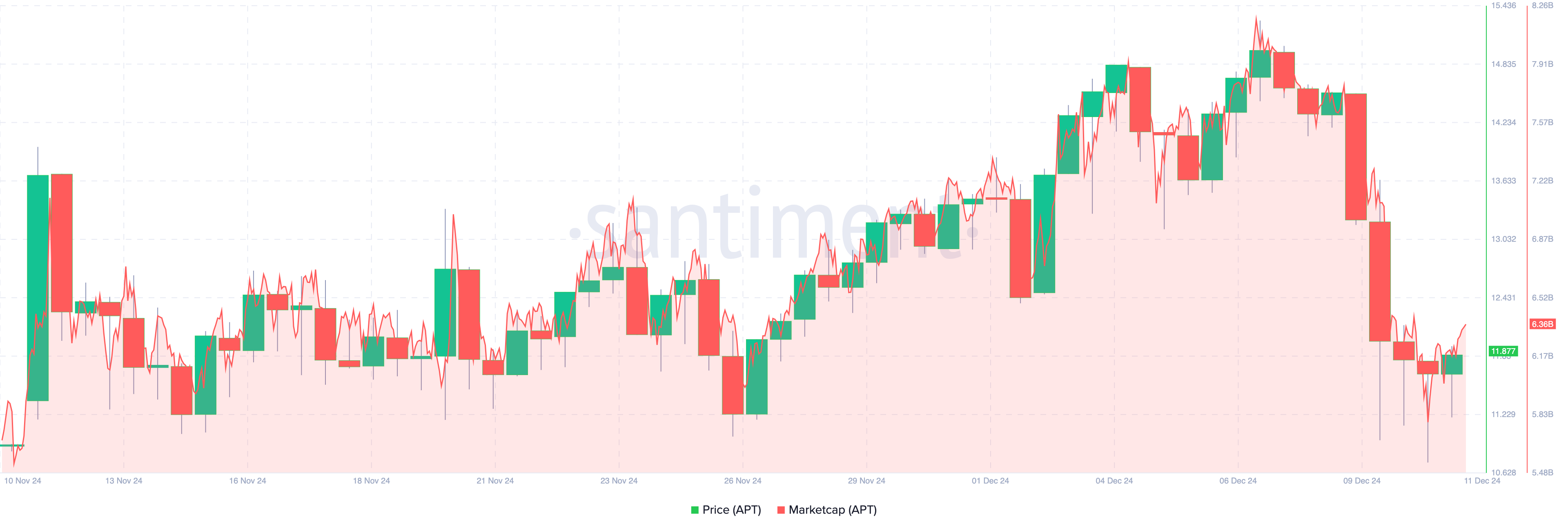6 Aralık’ta Aptos (APT), yaklaşık 8,25 milyar dolar piyasa değerine sahipti. Ancak şu anda piyasa değeri 6,36 milyar dolara düştü ve sadece beş gün içinde neredeyse 2 milyar dolar kaybetti.
