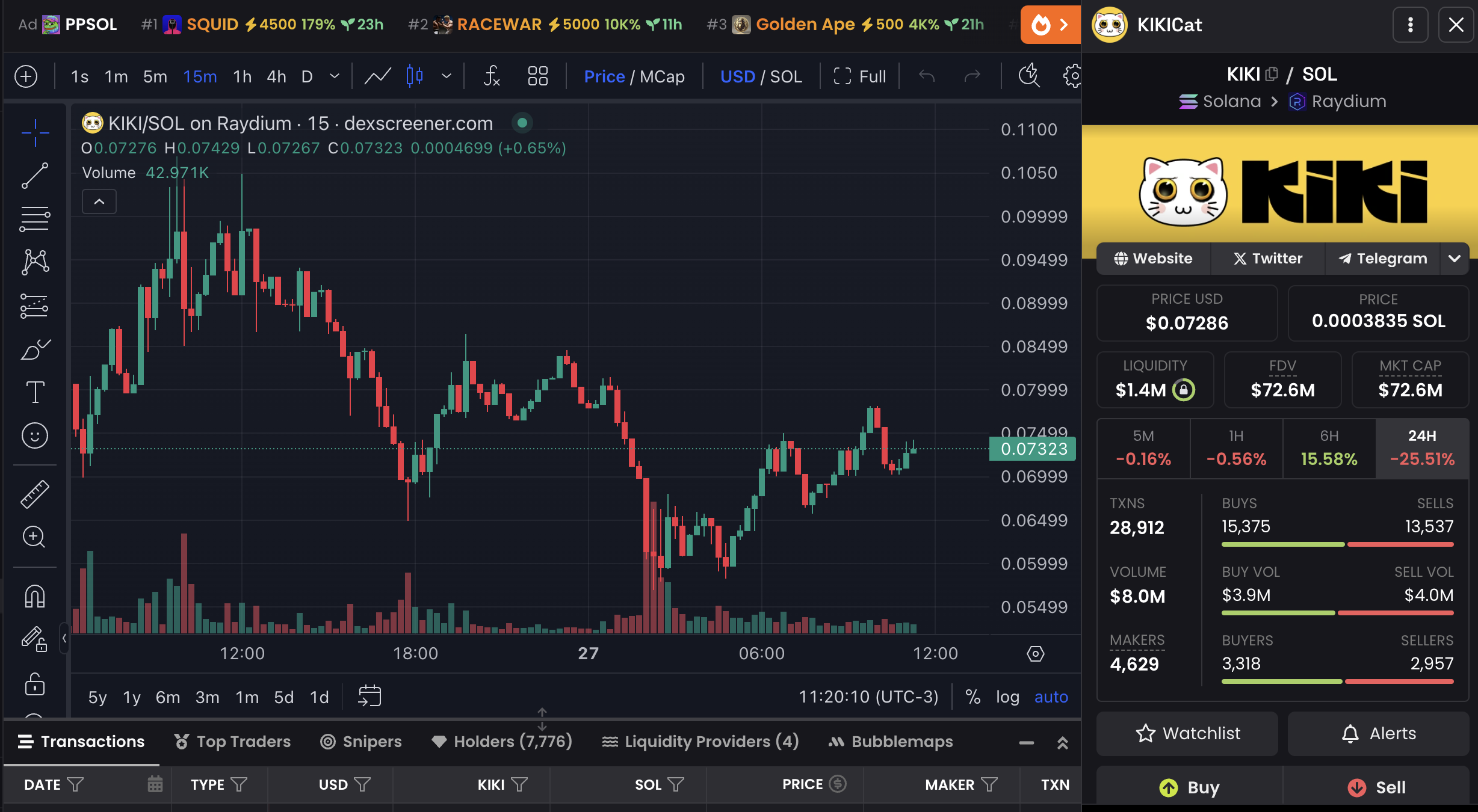 Yeni kripto paralar arasında, başlangıçta Pumpfun’da piyasaya sürülen ve daha sonra Raydium‘a taşınan bir meme coin olan KIKICat, sadece altı gün içinde hızla ivme kazandı. 7.700’den fazla sahibine ve neredeyse 29.000 günlük işleme sahip.