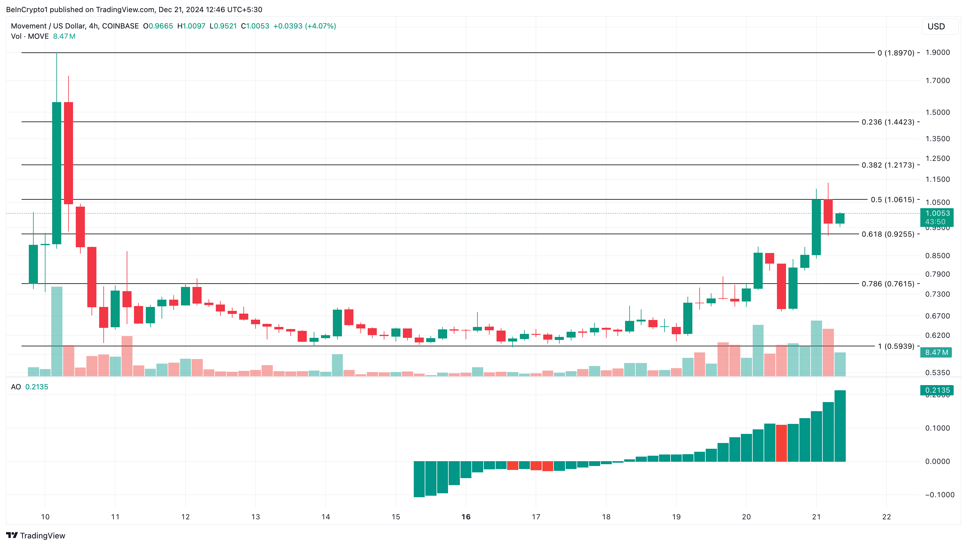 Fiyat artışı, token etrafındaki yükseliş hissiyatı ve artan alım baskısına bağlanabilir. Bu yazı itibarıyla, MOVE’nin fiyatı 1 dolara ulaştı. 4 saatlik grafik, Awesome Oscillator (AO) okumasının yükselmeye devam ettiğini gösteriyor.