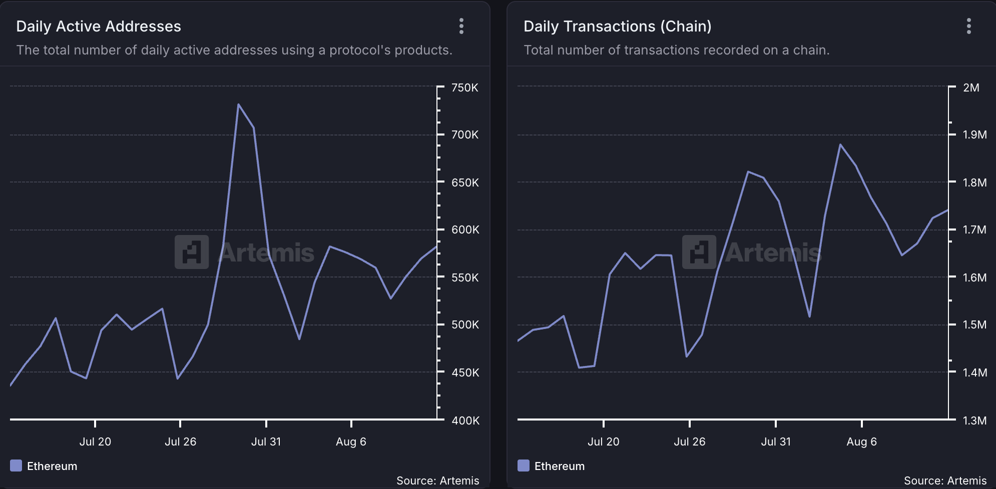 Arbitrum için artan kullanıcı talebi, Ethereum’un son ağ faaliyetlerini yansıtıyor. Artemis’e göre, Ethereum’un günlük aktif adres sayısı son birkaç haftada %33 artarken, işlem hacmi %10 yükseldi.