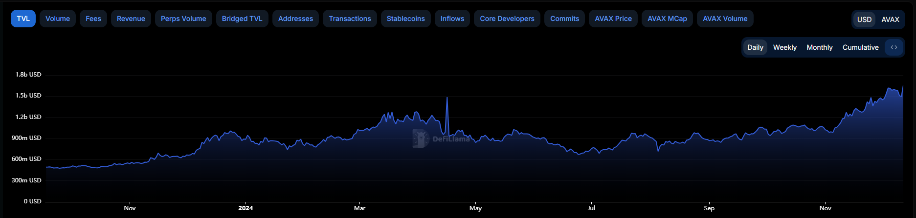 Tüm bunların ortasında, Avalanche blockchain başka bir dönüm noktasına ulaştı. Ağın Toplam Kilitli Değeri (TVL) 1,65 milyar doları aşarak neredeyse iki yılın en yüksek seviyesine ulaştı. TVL’deki büyüme, Avalanche’ın merkeziyetsiz finans (DeFi) sektöründeki çekiciliğine işaret ediyor ve potansiyel olarak yeni kullanıcılar ve sermaye çekebilir.