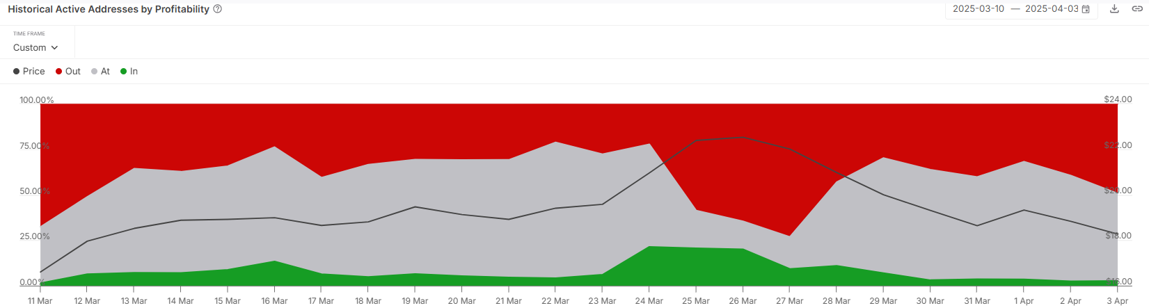 Aktif adres kârlılığını analiz etmek, mevcut katılımcıların %3’ünden azının kârda olduğunu ortaya koyuyor. Bu veri önemli bir detayı vurguluyor: Çoğu AVAX sahibi zararla satmak istemiyor. Bunun yerine, toparlanma beklentisiyle HODL yapıyorlar. Bu satış eksikliği, yükseliş göstergesi olarak kabul ediliyor.