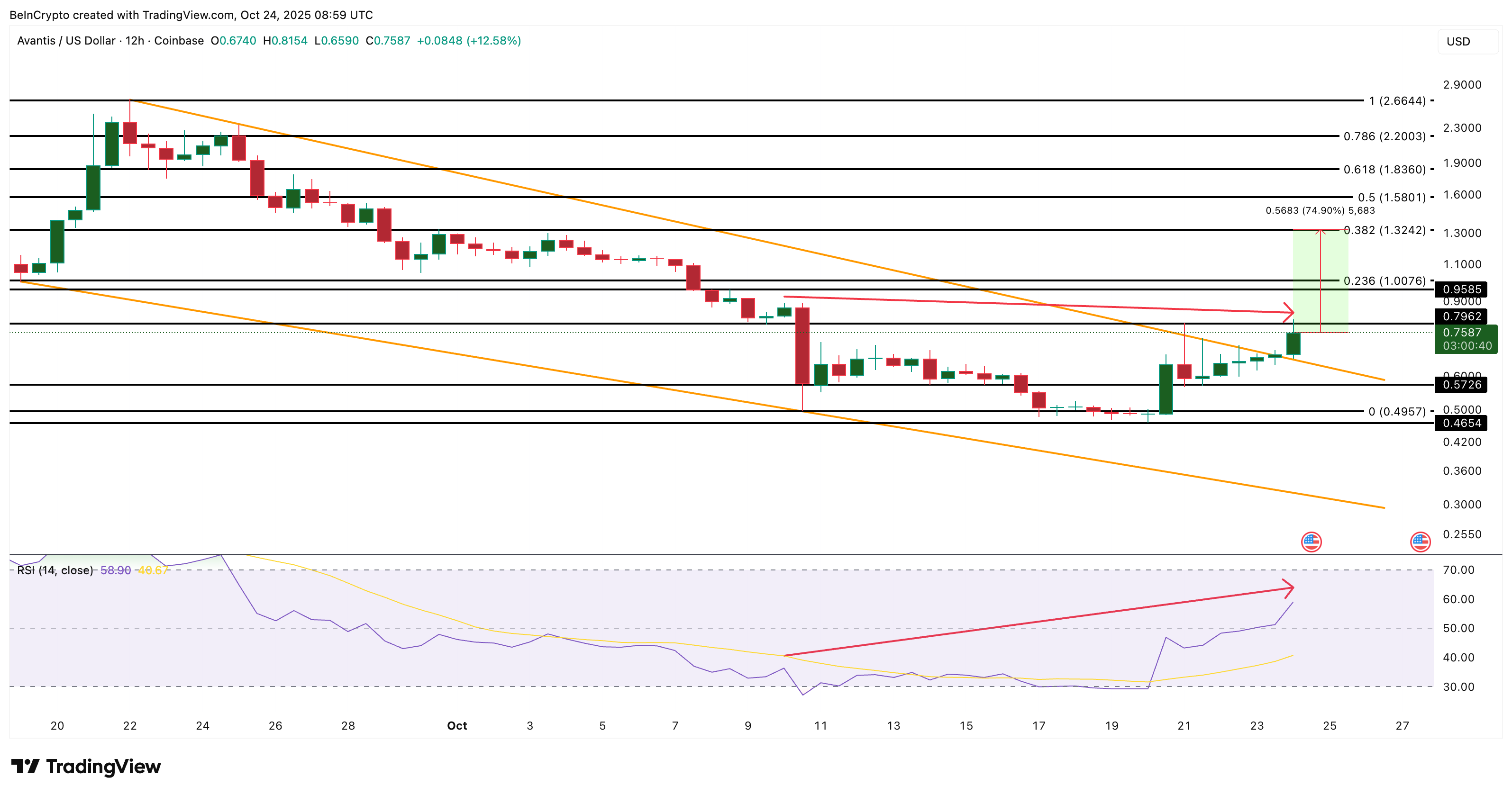 12 saatlik grafikte, Avantis fiyatı düşen bir kama içinde işlem görüyor — fiyatların daralan trend çizgileri içinde daha düşük zirveler ve daha düşük dipler oluşturduğu yükseliş yönlü bir yapı. Bu genellikle satıcıların kontrolü kaybettiğini gösterir.