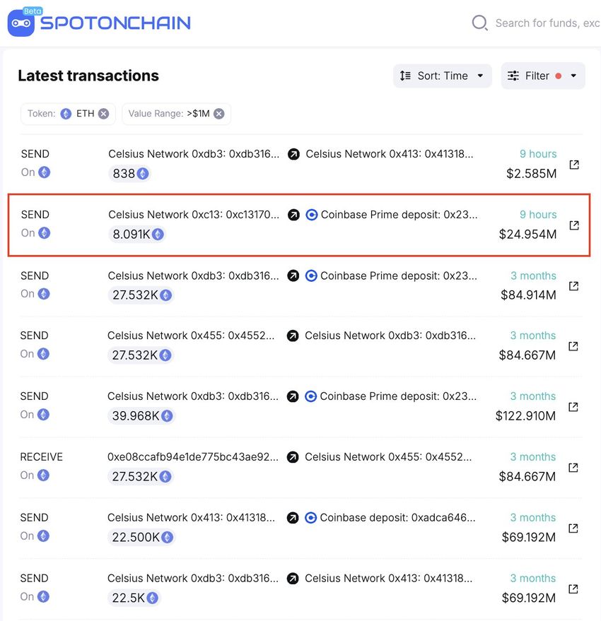 Ayrı ama kayda değer bir işlemde, Celsius Network 8.091 ETH ‘yi (yaklaşık 24,5 milyon $) Coinbase’e taşıdı. Blockchain analiz firması Spot On Chain bu işlemi 17 Nisan’da bildirdi.