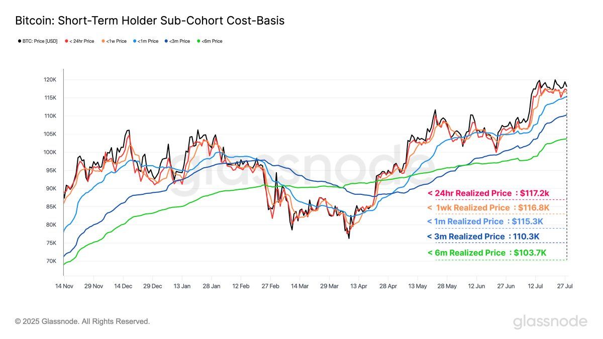 Kısa vadeli kar alma dalgasının yanı sıra, piyasa hala dikkate değer birkaç yükseliş yönlü gösterge sunuyor. Glassnode verileri, Bitcoin’in mevcut fiyatının kısa vadeli yatırımcı (STH) maliyet tabanı aralığının üzerinde olduğunu gösteriyor—bu, piyasa geri çekilirse güçlü destek bölgeleri oluşturmak için önemli bir faktör.
