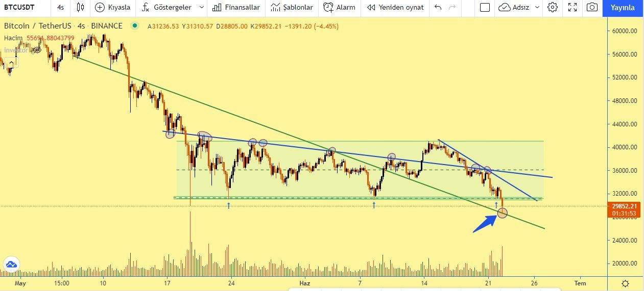 Lide kripto para birimi bir süredir ayı piyasasında bulunsa da bugüne kadar 30 ila 40 bin dolar arasında mekik dokudu. Geçtiğimiz haftanın ortalarında Elon Musk’ın Bitcoin ödeme sistemini yeniden açabileceğini ima etmesinin ardından bir kez daha 40 bin dolar seviyesine tırmanan BTC burada karşılaştığı direnci aşamayınca yeni bir düşüş trendi ile karşılaştı. Son düşüş trendi 30 bin dolar bandında bulunan destek seviyesini bir kez daha test etti. Gün içinde 28 bin dolar bandına kadar gerileyen Bitcoin burada sağlam bir destek bularak yeniden 30 bin dolar bandına yükseldi.