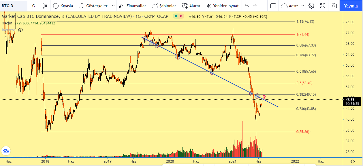 Bitcoin hakimiyeti %46’yı geçti. Ayı piyasasında karşılaşılan yükseliş trendleri de BTC lehine çalışıyor. Bitcoin’in değer kazanmaya başladığı dönemlerde birçok altcoin lider kripto para biriminin yakaladığı değer kazancı oranını aşmakta zorlanıyor. Bu nedenle hem düşüş hem de yükseliş trendlerinde Bitcoin hakimiyeti artmaya devam ediyor. Bitcoin dominans grafiğini de inceleyen başarılı analist Yılmaz son bir yıllık dönemde karşılaşılan Bitcoin dominans dip seviyelerine bir çizgi çekerek Bitcoin dominansının bir karar anında olduğunu belirtti.